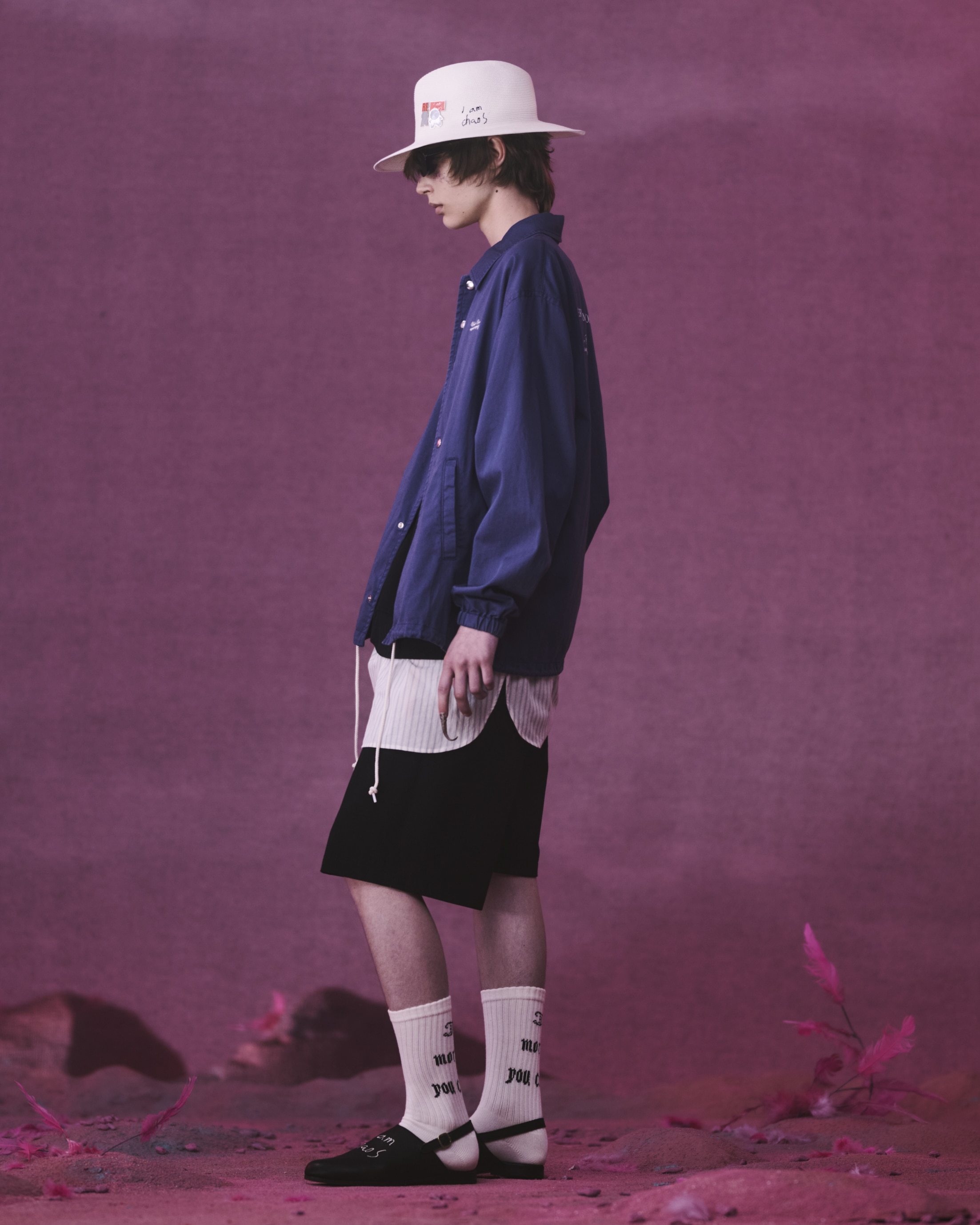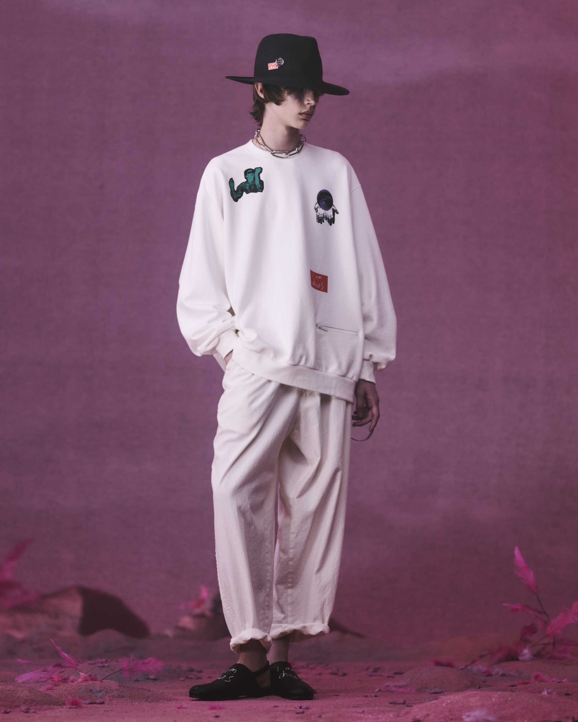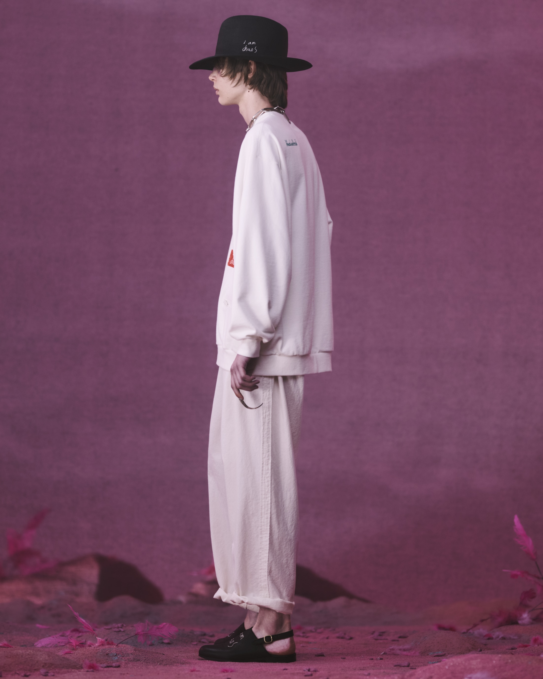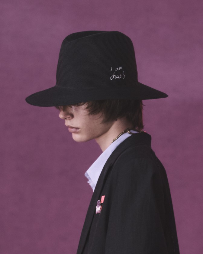KIJIMA TAKAYUKIとのコラボレーションによるペーパーブレードハットは、サイドに「I am chaos」の刺繍を施しました。エレガンスとウィットが共存するデザインに、軽量かつ柔らかな素材感が加わり、都市とリゾートの境界を軽やかに行き来するためのピースとして位置付けられています。