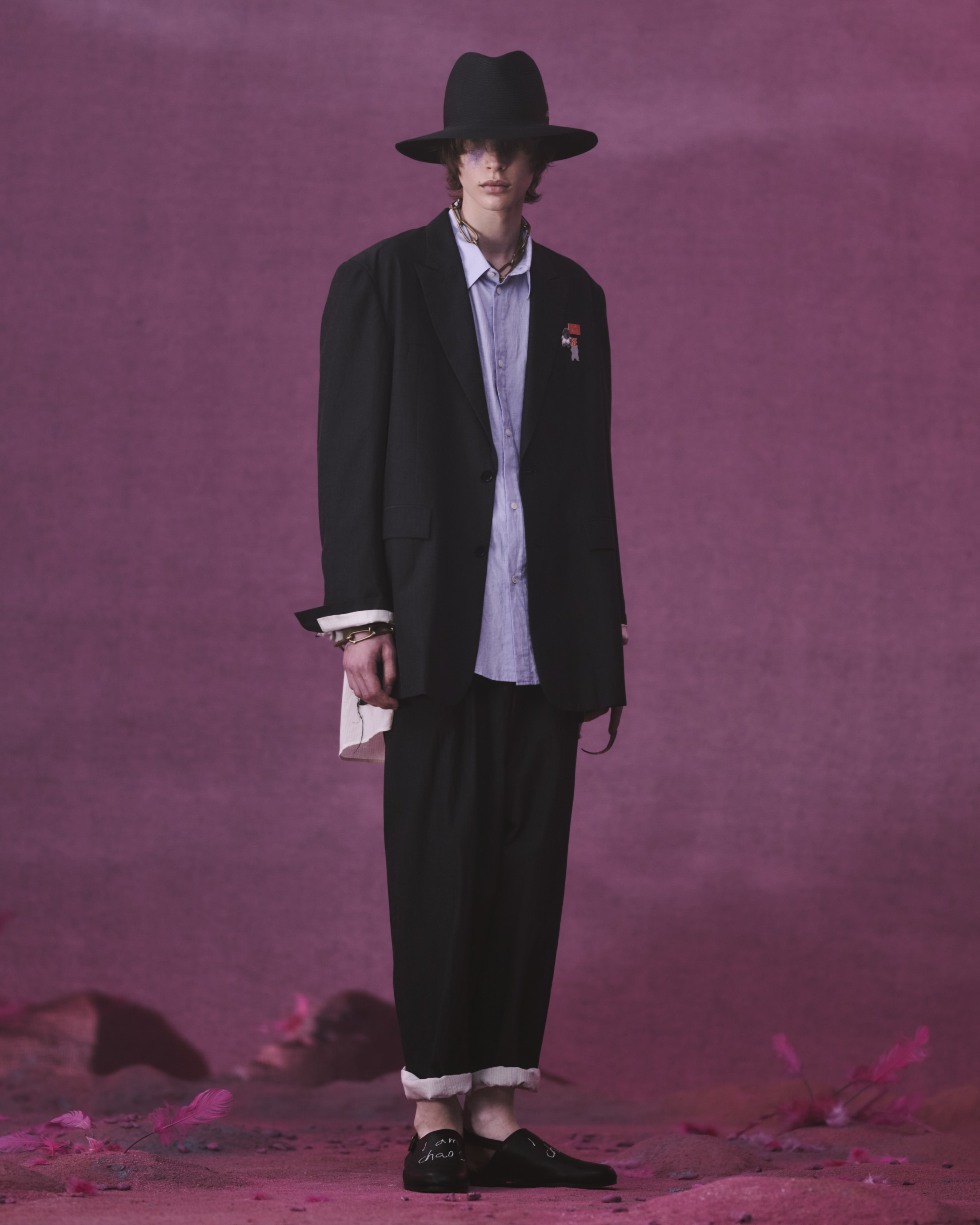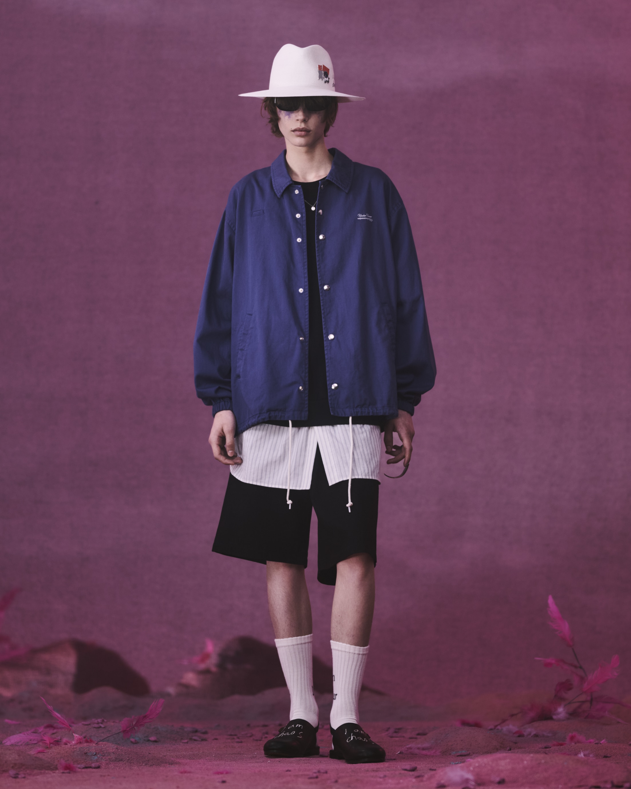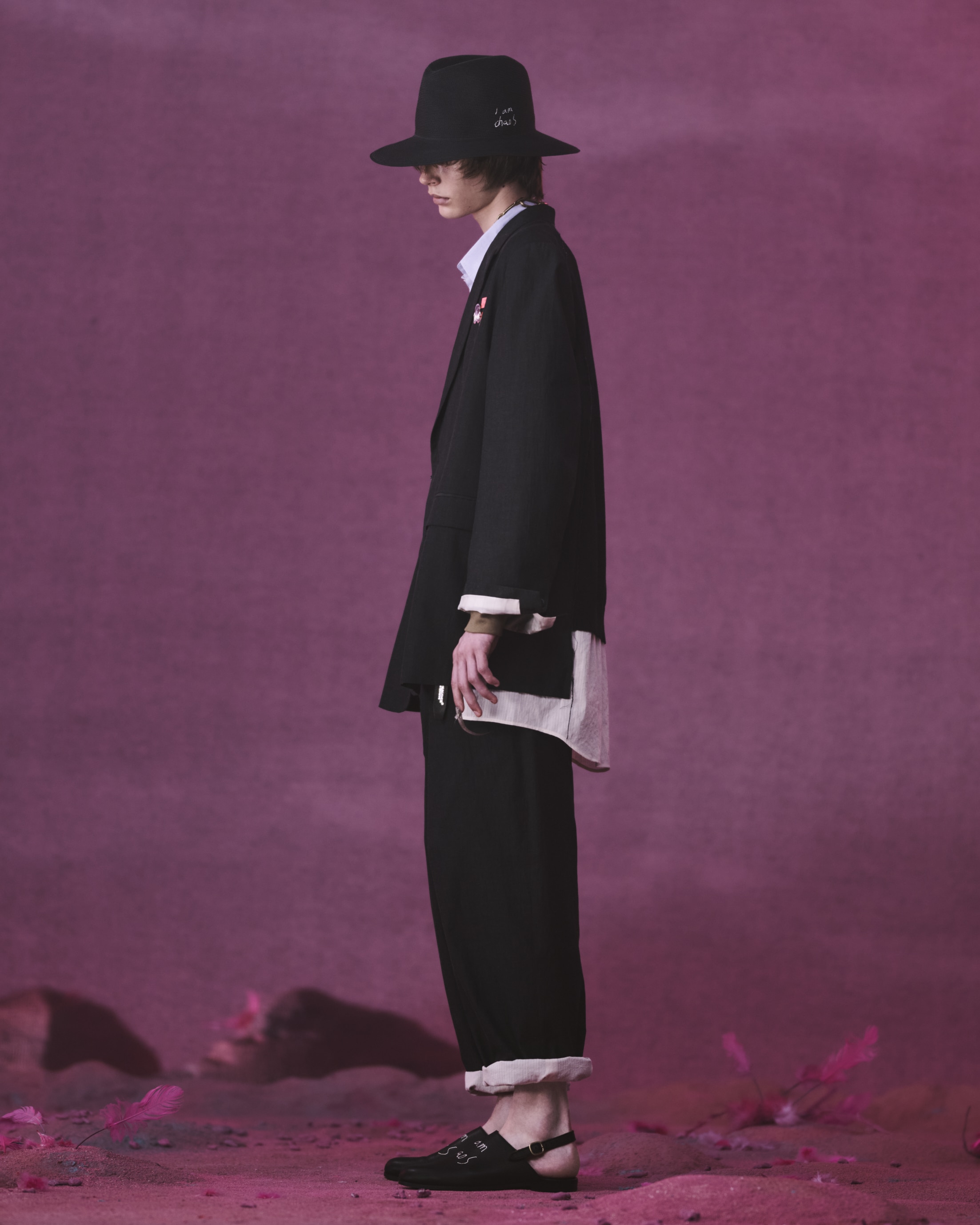 KIJIMA TAKAYUKIとのコラボレーションによるペーパーブレードハットは、サイドに「I am chaos」の刺繍を施しました。エレガンスとウィットが共存するデザインに、軽量かつ柔らかな素材感が加わり、都市とリゾートの境界を軽やかに行き来するためのピースとして位置付けられています。