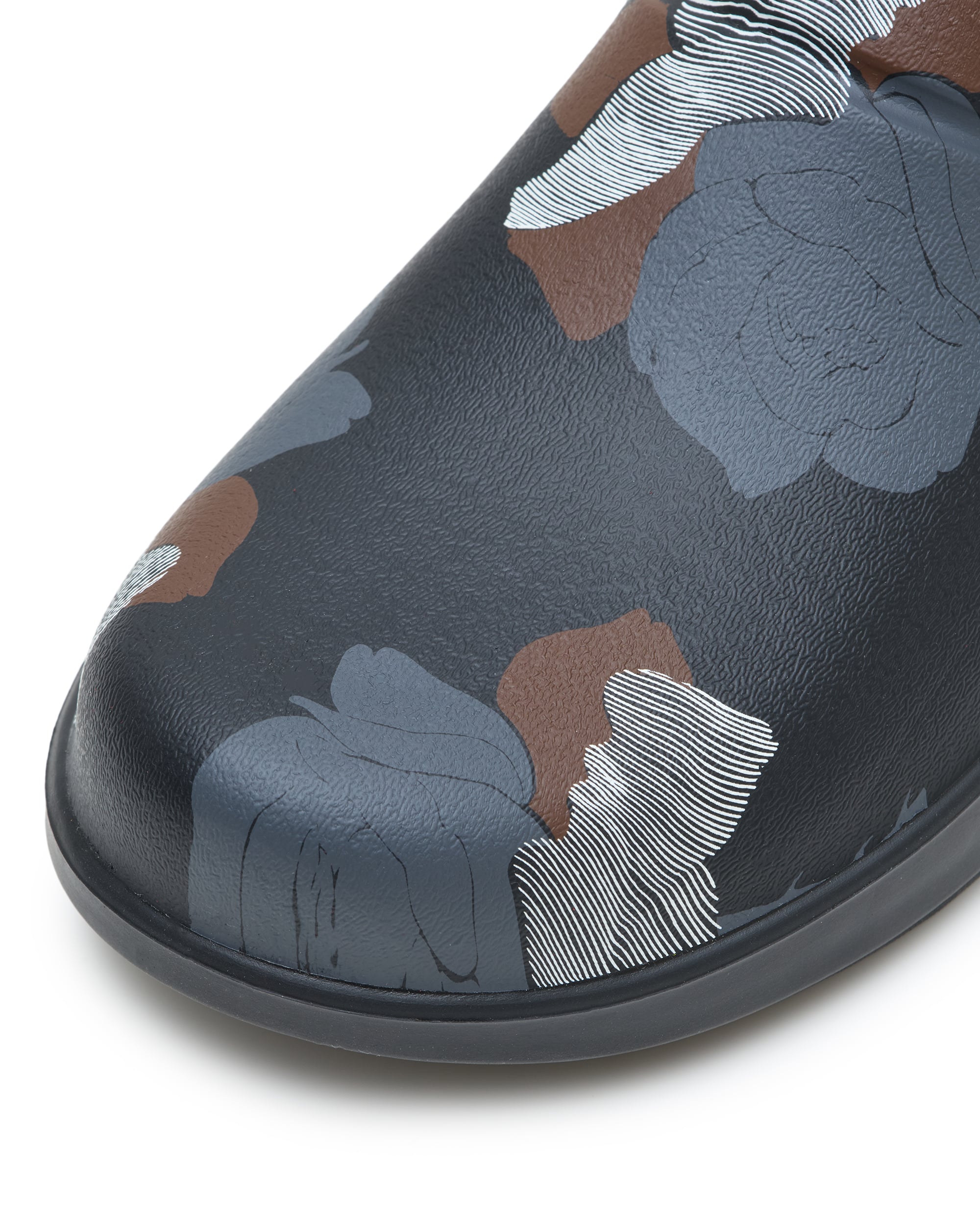 コレクションに登場するセットアップと同じ総柄をアッパーにあしらったクロッグは、仕事場やレジャーで大活躍する万能アイテム。UNDERCOVERの空気感を纏ったパターンで、コレクションピースとも自然に馴染むデザインに仕上げました。