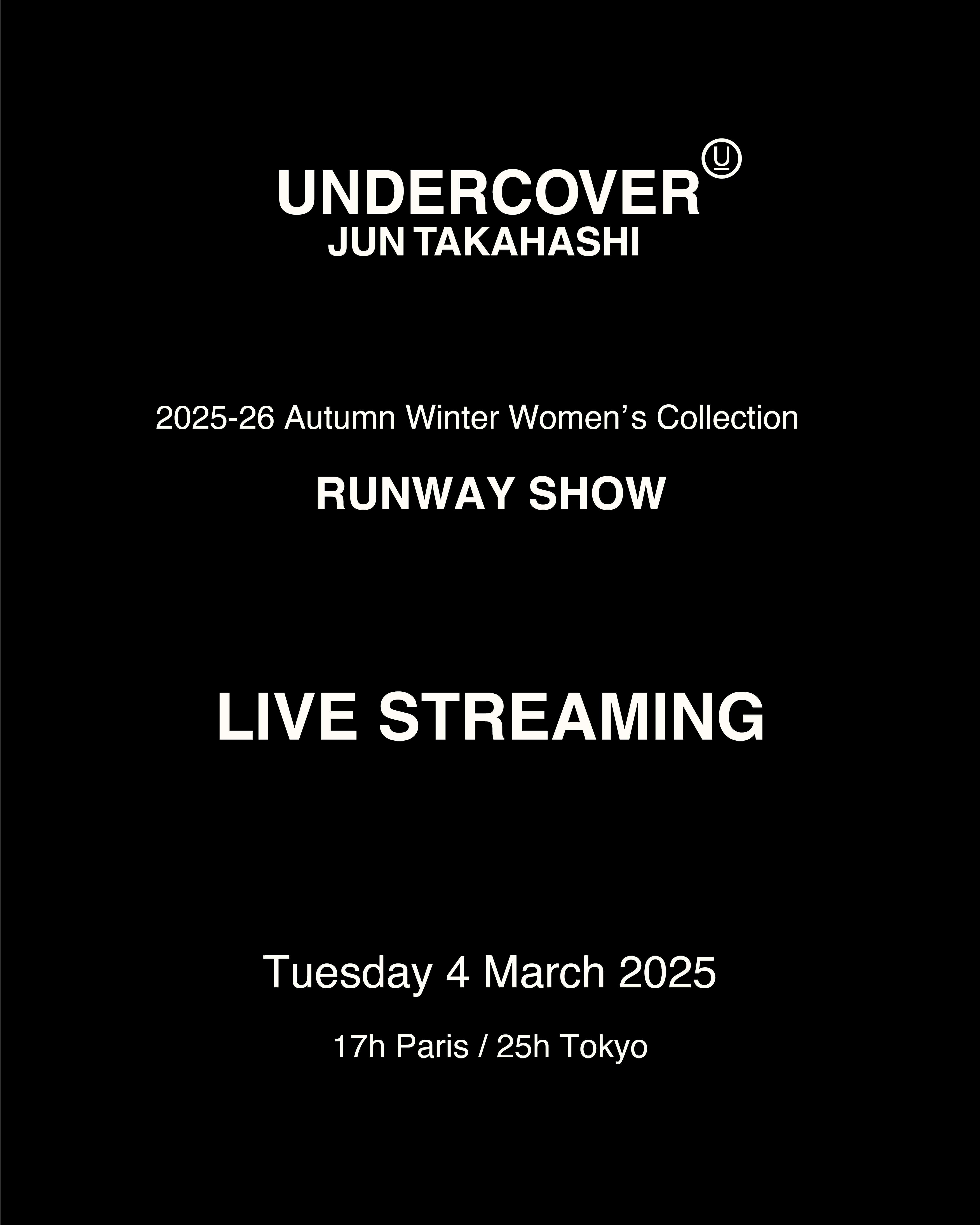 2025年3月4日(火)17:00(日本時間:25:00)より、フランス・パリにて開催されるUNDERCOVER 2025年秋冬ウィメンズコレクションのショーを本サイトおよびインスタグラムのアンダーカバー公式アカウント @undercover_lab にてライブ配信いたします。